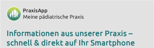 Holen Sie sich die PraxisApp Meine pädiatrische Praxis im App Store (iPhone) oder bei Google Play (Android) und melden Sie Ihr/e Kind/er bei einem unserer Ärzte an.Sie haben eine kurze Frage an uns oder wollen uns Befundfotos schicken? Sie möchten Rezepte oder Überweisungen bestellen? Dafür nutzen Sie bitte die Chat-Funktion der PraxisApp - eMails sind aus Sicherheitsgründen nicht geeignet.Termine können weiterhin online oder telefonisch vereinbart werden.Sie erhalten Hinweise auf anstehende Impfungen und Vorsorgen, Erinnerungen an Ihre Termine sowie aktuelle Informationen unserer Praxis direkt auf Ihr Smartphone!Über die PraxisApp sind unkomplizierte Videosprechstunden möglich. (Anleitung)Aktivieren Sie Push-Meldungen für die PraxisApp. Die PraxisApp ist werbefrei und für Sie kostenlos. Sie hat keinen Zugriff auf sensible Daten Ihres Smartphones.